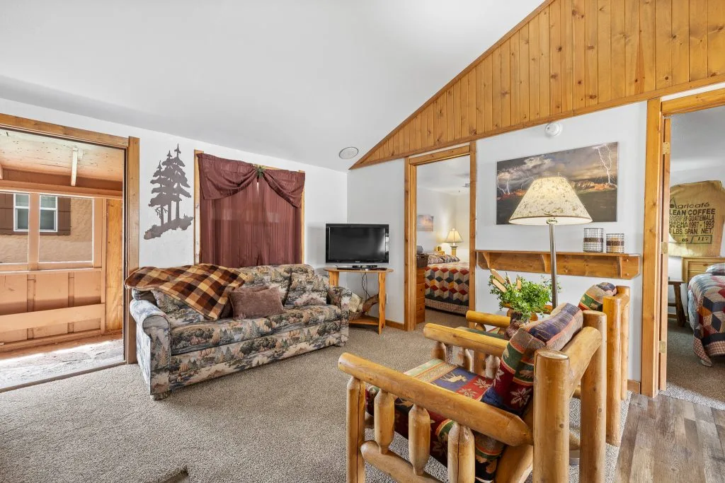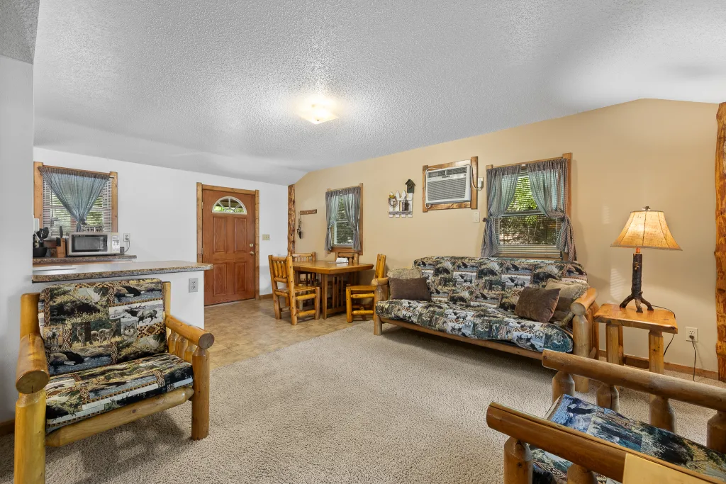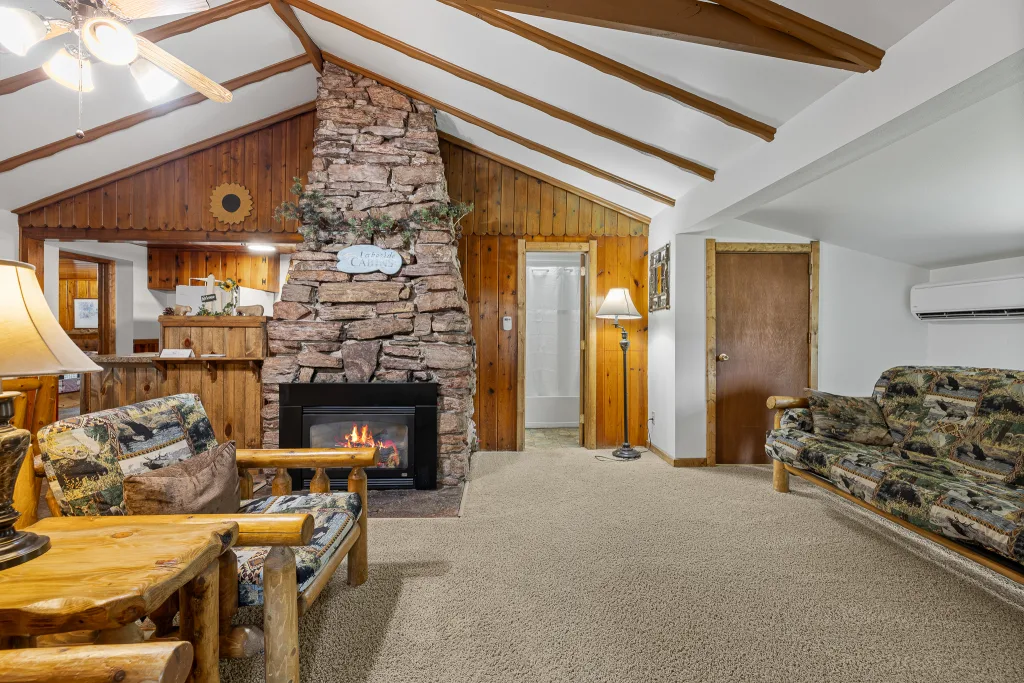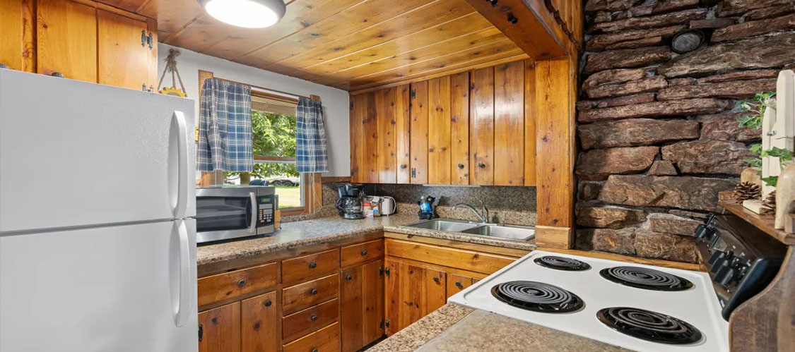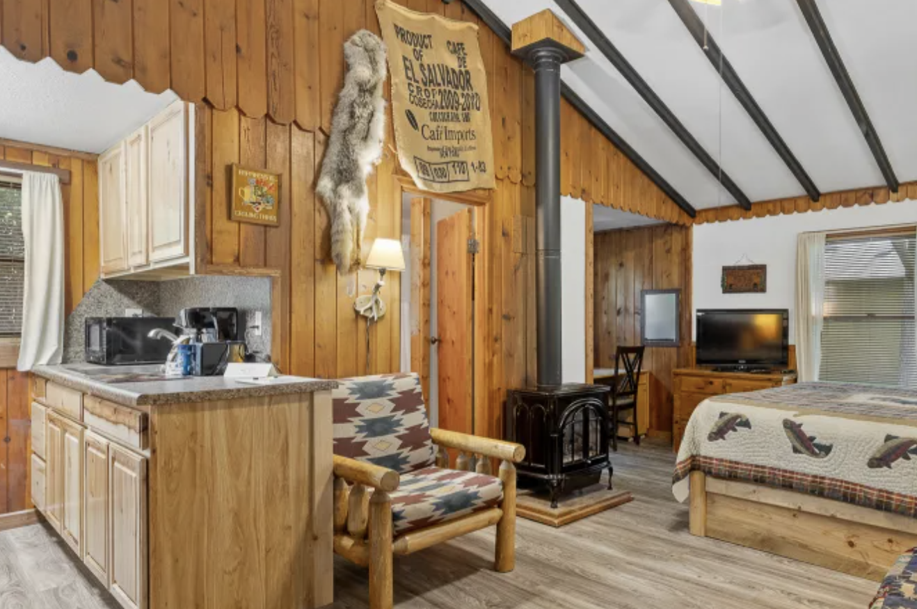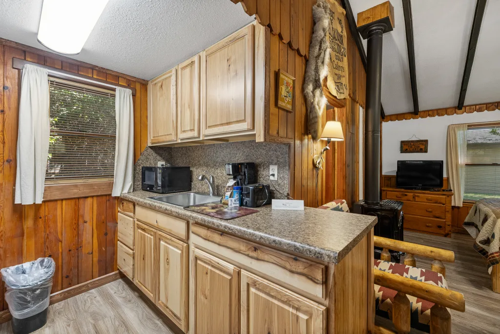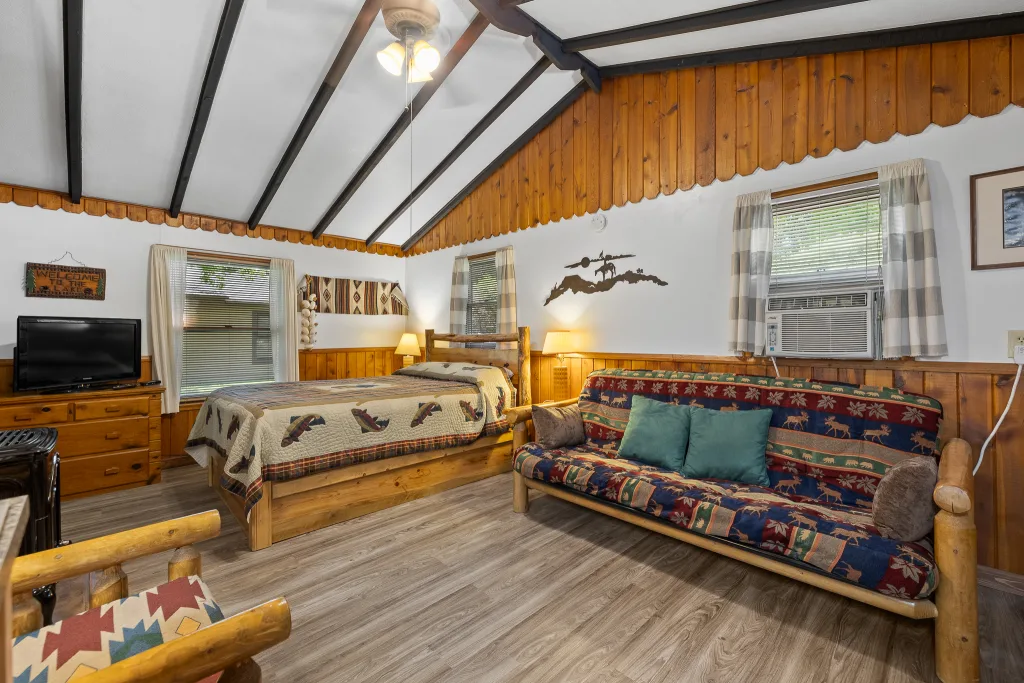 Our deluxe studio cabins each have 1 queen-sized bed plus a futon and 1 bathroom. Let them take you back to a simpler time with their knotty pine interior, lodge decor, and open floor plan.