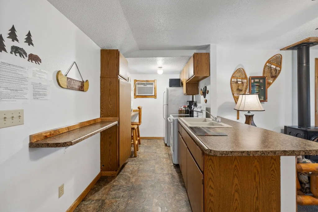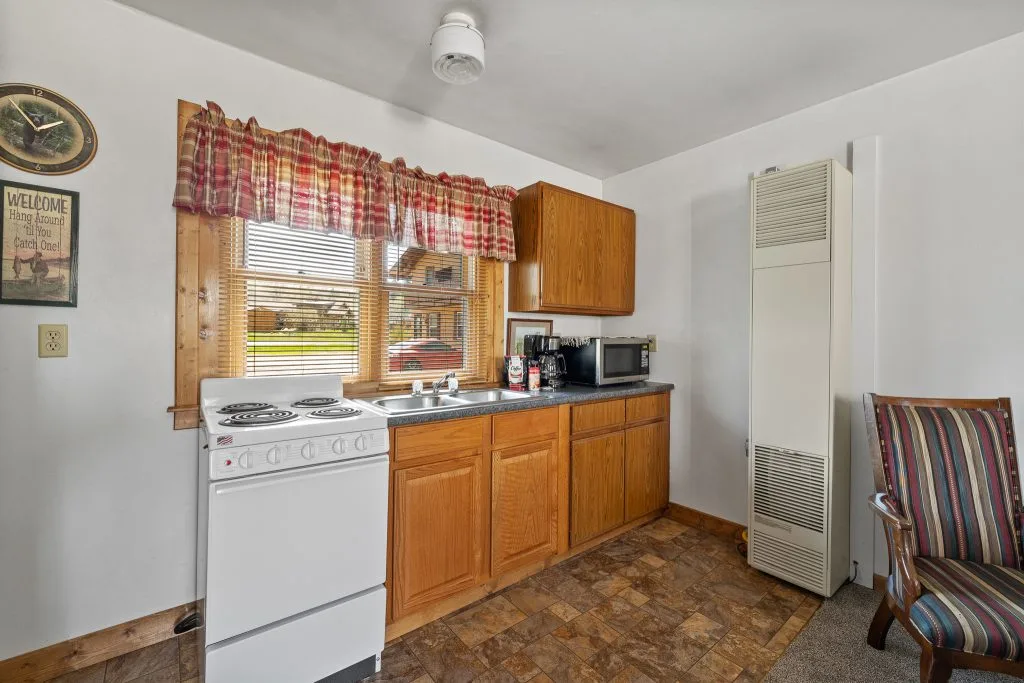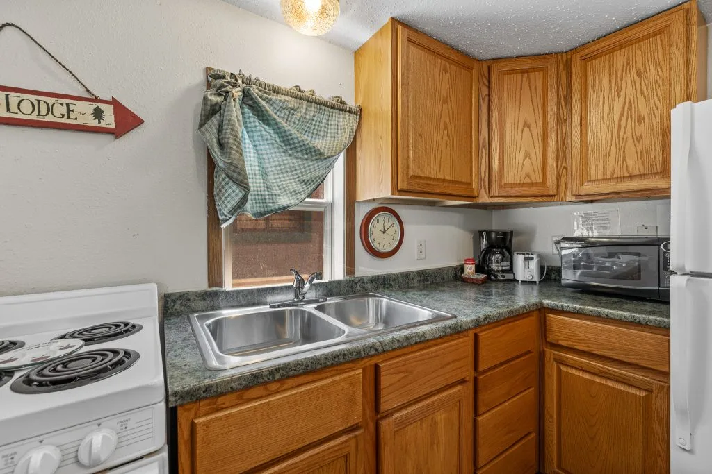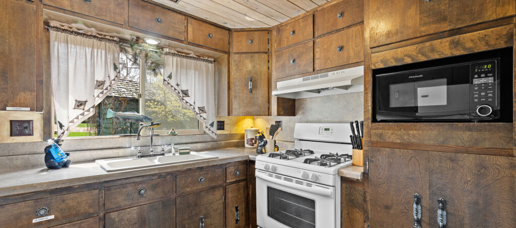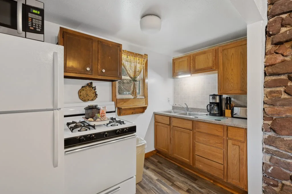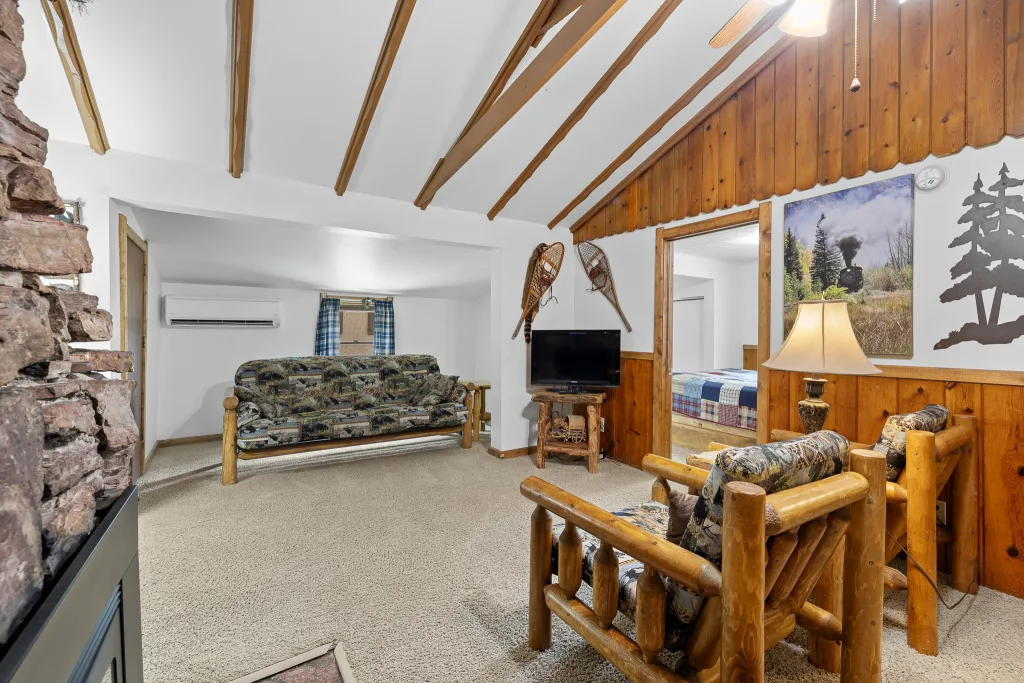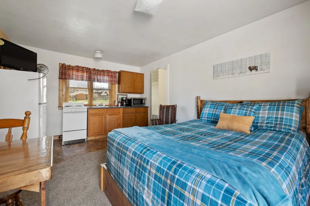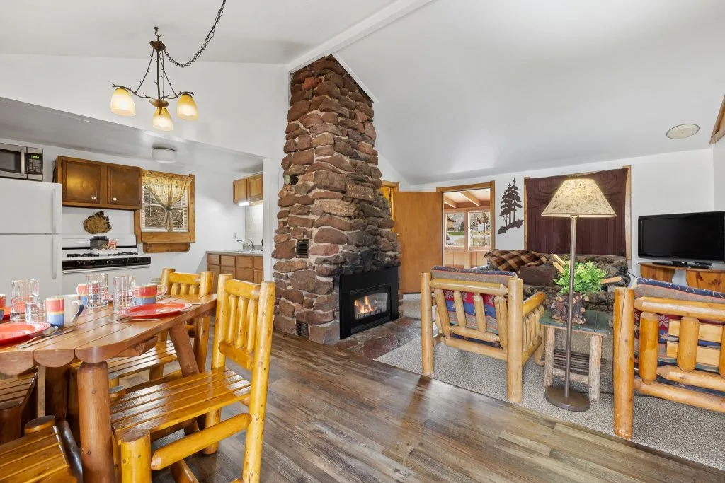 Our deluxe studio cabins each have 1 queen-sized bed plus a futon and 1 bathroom. Let them take you back to a simpler time with their knotty pine interior, lodge decor, and open floor plan.