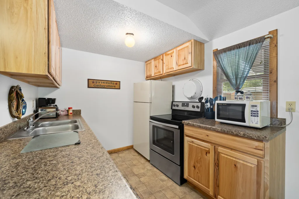 Our 2-bedroom, 1-bathroom cabins is perfect for up to 6 people! Enjoy cooking a meal on the grill while the family enjoys a game of ball out front with a patio!