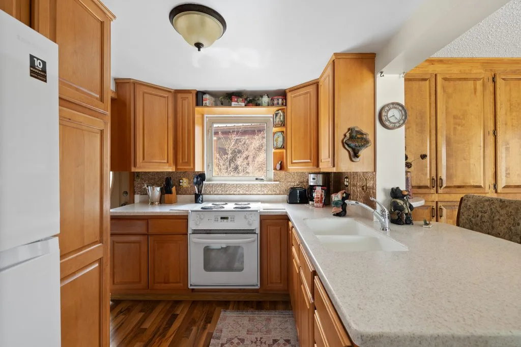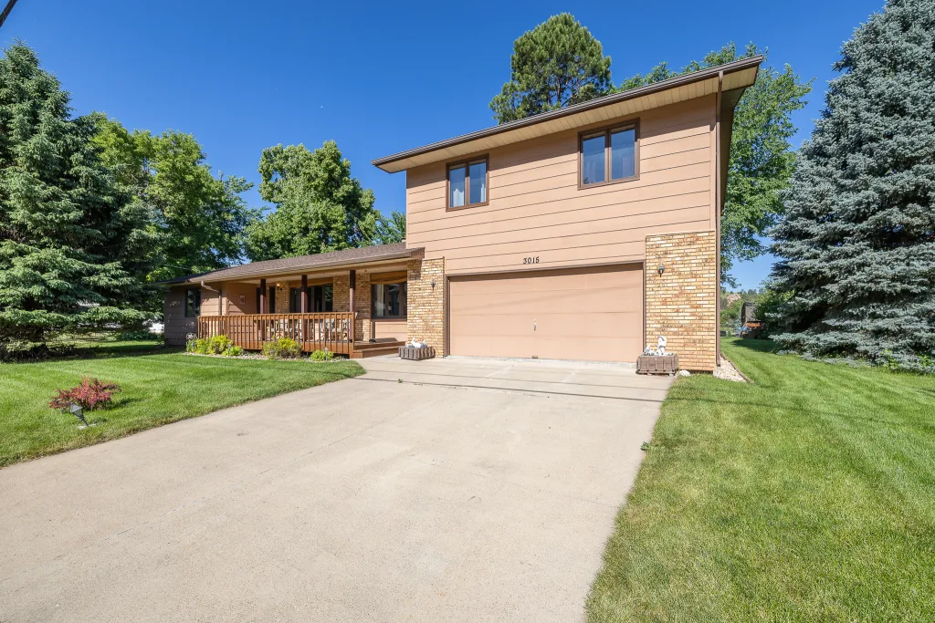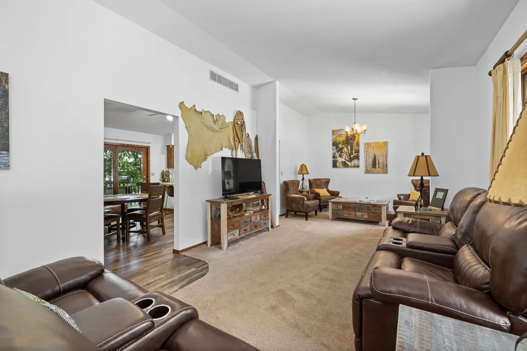 A 4-bedroom vacation home with 6 queens and 1 full bed, 3 bathrooms, 2 kitchens, 2 dining areas, large wrap-around deck, and 3-car garage.